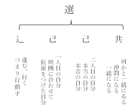 そこで今朝文章を書いている時にある字を書いた途端に、書きながら気づいたことがあり、さっそく字分けをして見ました。選択の「選」です。手で書きながらブルブルと体に反応が出るときはその日時も控えておく習慣があり、今それをワープロに入力しているわけです。先に手書きにすることが必須です。脳の違う部分が働くからです。絵を描く時や字を手で書く時は主に右脳、ワープロ入力する時は左脳が少し働き始めますので。